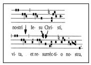 Il nostro introito canta in modo straordinario questa trasformazione, che è la nostra Pasqua. Se osserviamo infatti la seconda riga (“nostri Jesu Christi”) e contemporaneamente osserviamo anche la terza riga (“vita et resurrectio”), constatiamo che le due enunciazioni del testo sono rivestite con lo stesso frammento melodico, con gli stessi identici suoni, in uno slancio verso l’acuto, fino all’apice del nostro canto.